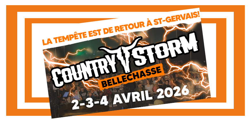 C'est officiel, on fait la 3e édition du Festival NEW COUNTRY dans Bellechasse! La tempête NEW COUNTRY va frapper le Centre Socio-Culturel de St-Gervais les 2, 3 et 4 avril 2026. COUNTRY STORM c'est 3 soirées de spectacles, des milliers de cowboys et country girls au cœur du village de St-Gervais.