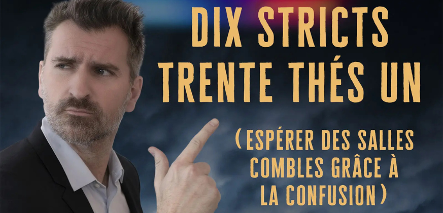 Je sais pas si le titre et le visuel de mon spectacle vous ont bernés? Tel un coquin tannant, je l’ai intitulé Dix Stricts Trente Thés Un dans l’espoir que des fans de cette ancienne émission populaire pensent que celle-ci est maintenant rendue sur scène et qu’ils achètent des billets pour mon show par erreur. Vraiment une supercherie de bas-étage, j’en conviens. Pardon. Ce gag bon enfant et absurde reflète tout de même le style d’humour que je préconise encore après 20 ans de carrière. En effet, dans ce 4e show, mon absurdité et mon ironie teinteront toujours mon univers, MAIS je continue à m’ouvrir davantage sur des trucs réels que j’ai vécus, trucs souvent absurdes en soit, comme de quoi la vie a peut-être décidé de me faire subir ces absurdités que j’impose à mes fans depuis mes débuts. Juste retour de l’ascenseur peut-être? Si ça vous intrigue, venez faire un tour, j’en serais ravi. Merci d’avance de votre support, je suis sincèrement très reconnaissant. Je vous souris présentement, ce qui fait que je vous regarde avec un visage TOUT SAUF STRICT!