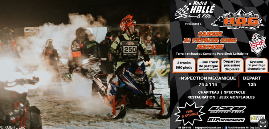 LE PLUS GROS SHOW d’accélération de motoneige, présenté par André Hallée et fils, un rendez-vous à ne pas manquer à Matane le 21 février 2026.